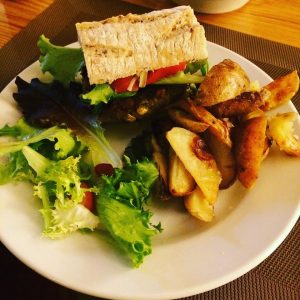 - Home-made mixed bean or chickpea burger with sweet potato wedges & seasonal salad